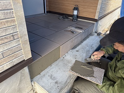 玄関ポーチタイル施工中